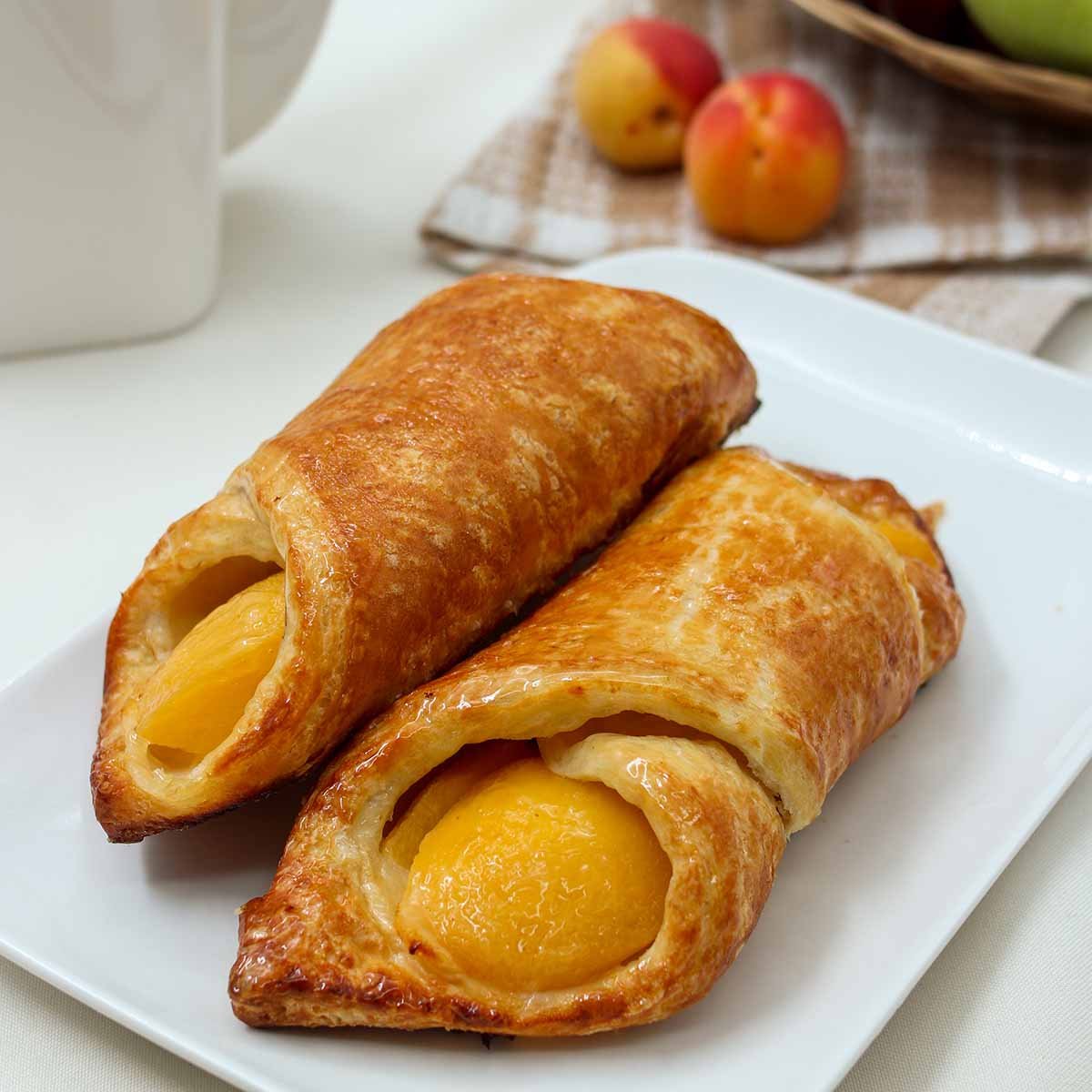 Мука пшеничная в/с, маргарин для слоеного теста, персик консервированный, повидло клюква/яблоко, сахар-песок, масло сливочное, яйцо куриное, гель кристалин, молоко, дрожжи, сахарная пудра, масло растительное, соль, улучшитель.