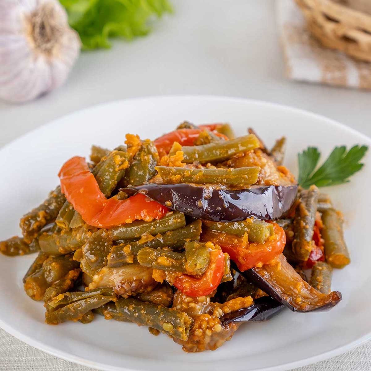 Перец болграский, фасоль стручковая с/м, баклажаны, масло подсолнечное, соус кисло-сладкий, чеснок, соль, перец ч/м