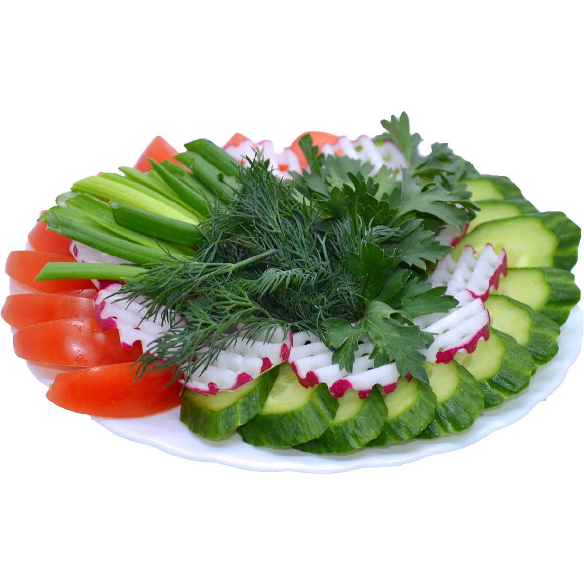 Помидоры, огурцы, редис, лук зеленый, зелень