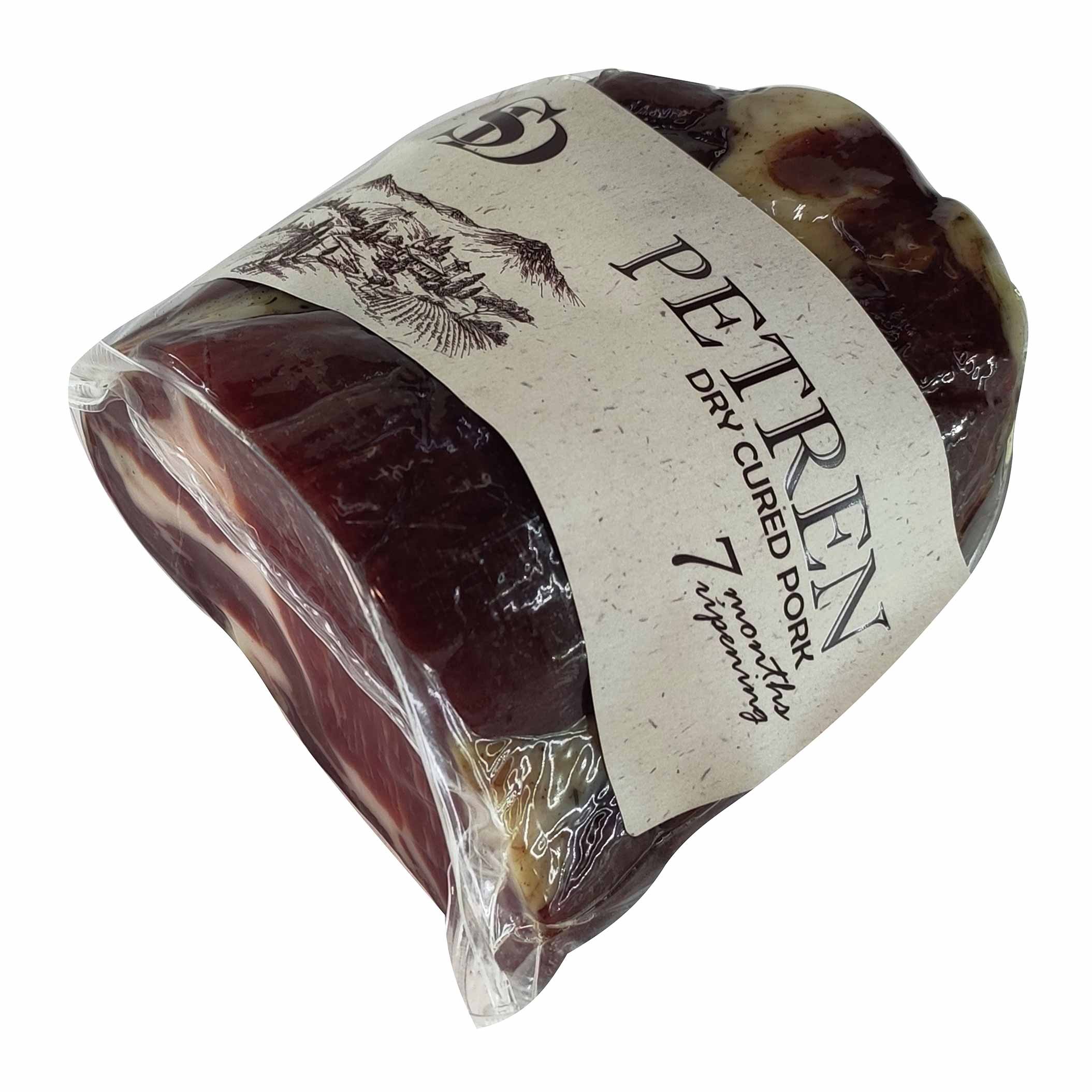 Свинина, соль морская, паприка, перец черный горошком, тимьян, зира, смесь посолочно-нитритная (соль поваренная пищевая, фиксатор окраски нитрит натрия), кориандр, хмели-сунели, чеснок, сумах, пажитник.