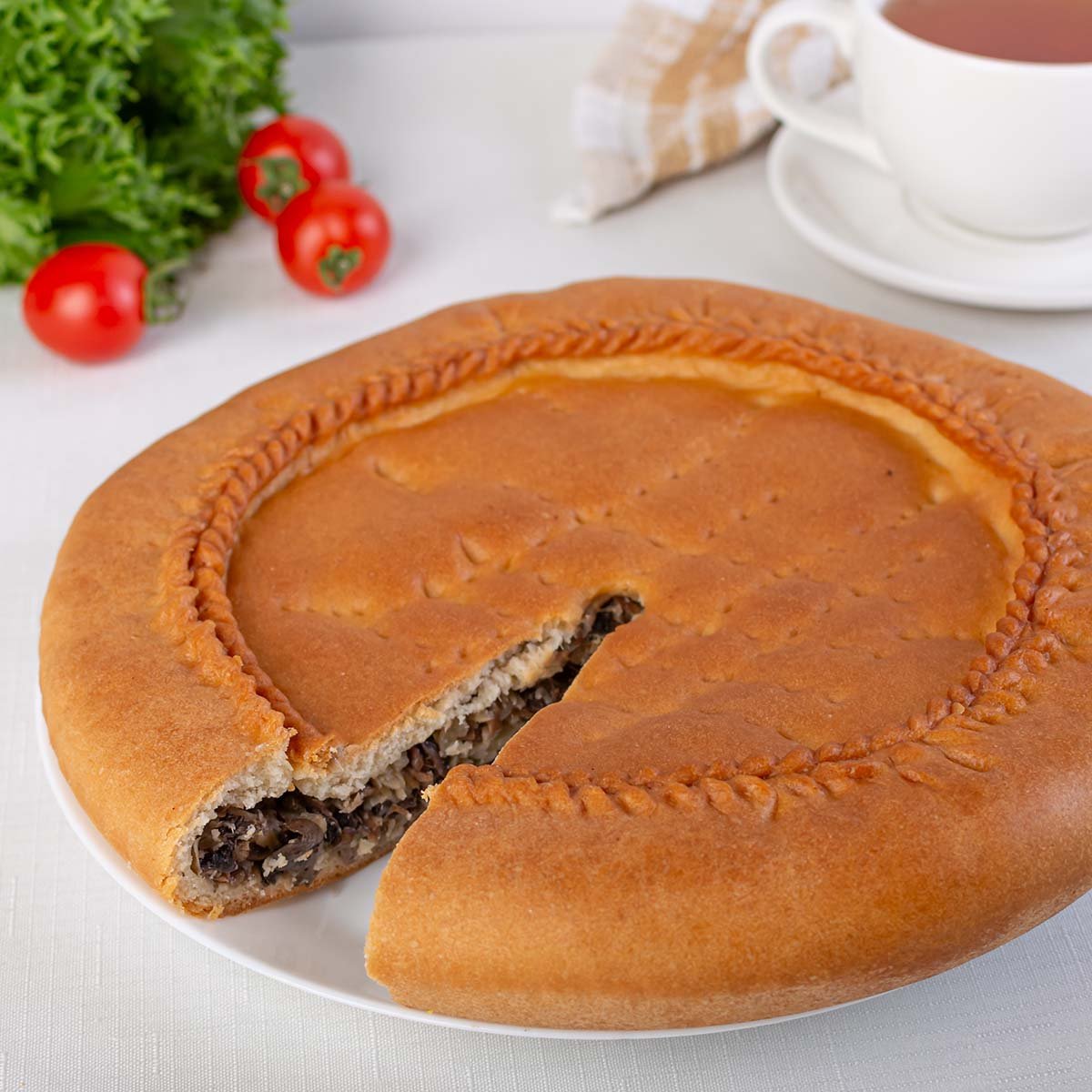 Большой сытный пирог с начинкой из припущенных грибов-шампиньонов, капусты и лука. Закрывается тестом и запекается до золотистой корочки.