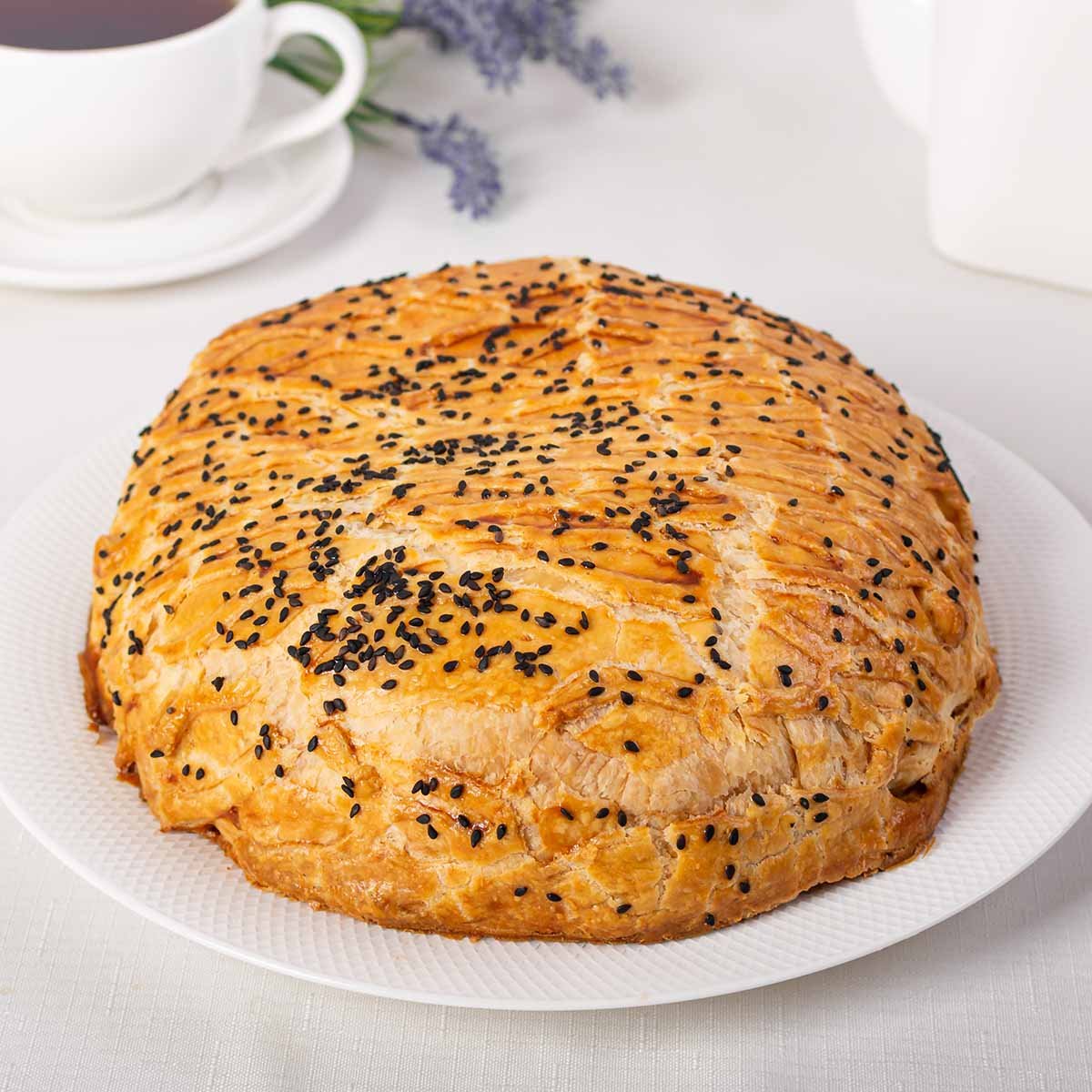 Сытный пирог из слоеного дрожжевого теста с начинкой из мяса говядины и картофеля. Угощайтесь с горячим чаем или подавайте в качестве второго блюда на обед.