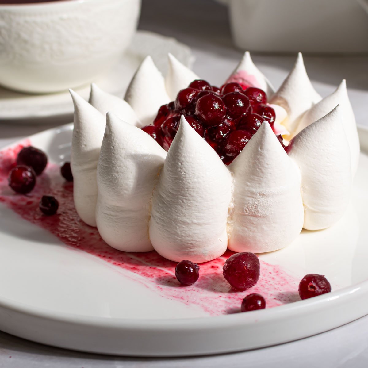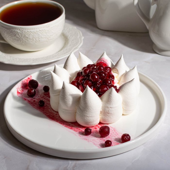 Белоснежные пики воздушного безе и алую клюкву связал в единый гармоничный десерт сливочно-творожный крем. Легкое пирожное, в котором в идеальном балансе сочетается сладкая меренга и кислая лесная ягода. Хрустящее снаружи и нежное внутри оно непременно покорит вас своим изысканным вкусом.