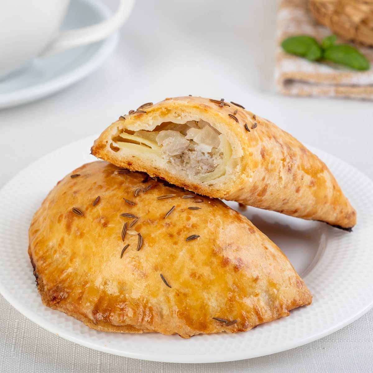 Нежная начинка из филе минтая и судака в сочетании с отварным картофелем, репчатым луком и ароматным тмином под золотистой корочкой пышного сырного теста. Выпечка характерна сбалансированным чуть сладковатым вкусом и потрясающим ароматом.