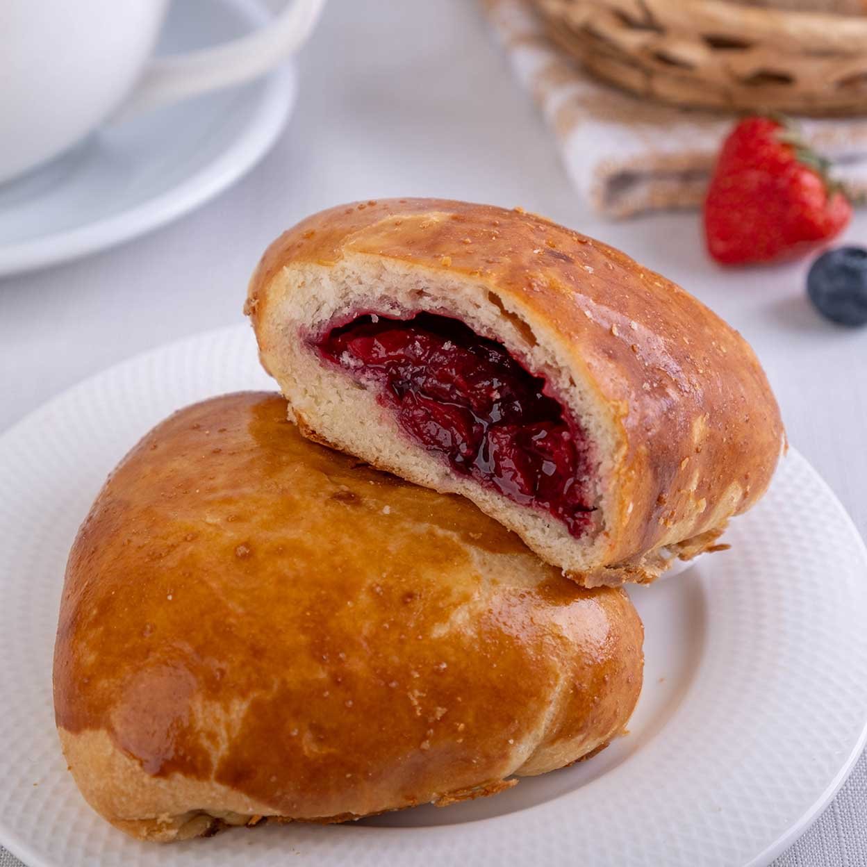 Мука пшеничная в/с, молоко, масло сливочное, сахар, соль, яйцо куриное, вишня с/м, дрожжи хлебопекарные. Возможное попадание косточки от вишни.