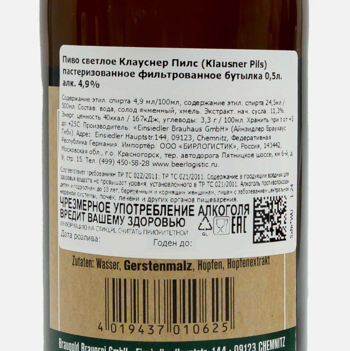 Пиво Клауснер Пилс свет фильтр паст 4.9% ст/б 0,5л