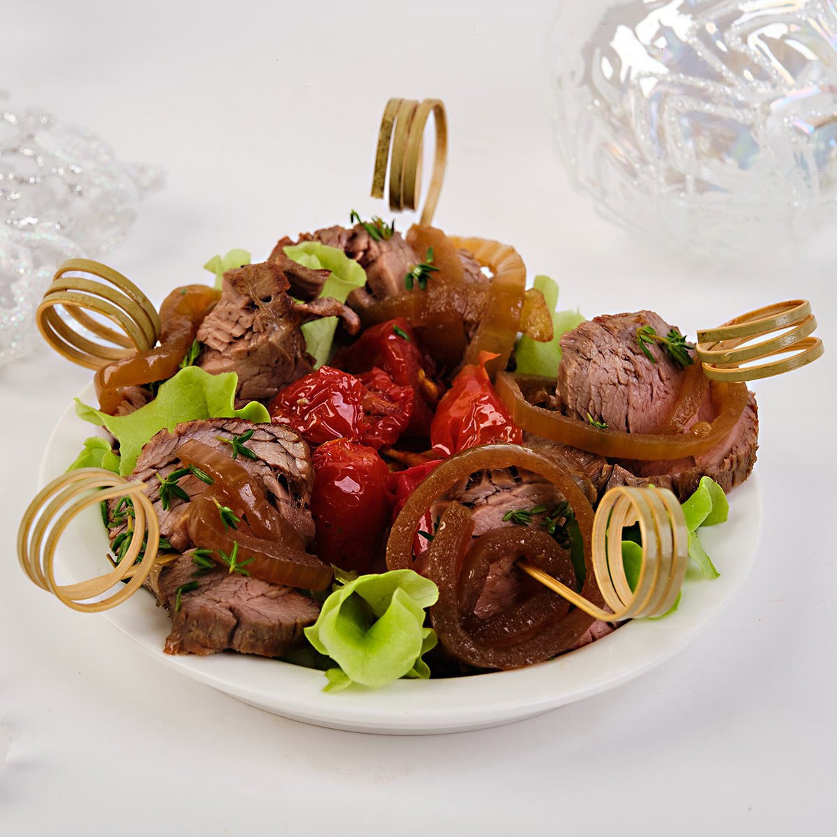 Говядина, лук репчатый, масло подсолнечное, соль поваренная, перец черный молотый, соус соевый, кориандр зерновой, помидоры Черри, приправа итальянские травы, сахар-песок, тимьян