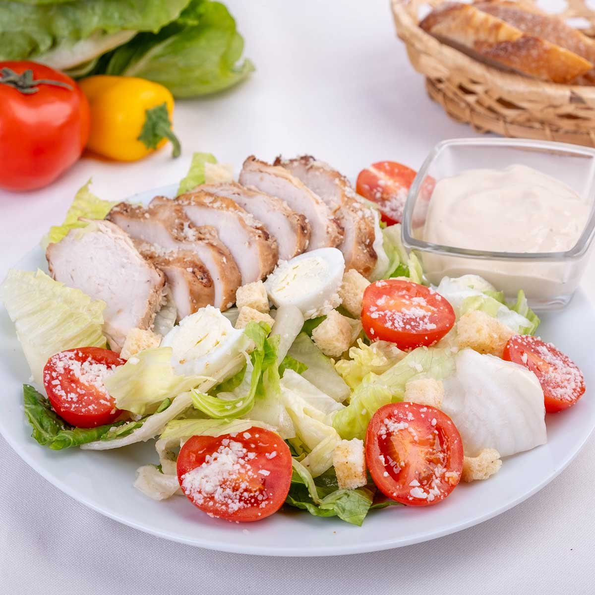 Салат айсберг, салат романа, филе куриное, помидоры черри, яйцо перепелиное, сыр пармезан, майонез, соевый соус, батон нарезной, оливковое масло, чеснок сушеный, соус (яйцо куриное, горчица, анчоус в масле, соус устричный, сок лимона, масло кукурузное, чеснок сушеный).