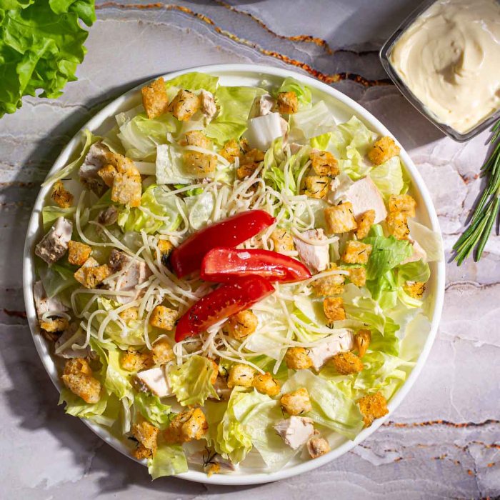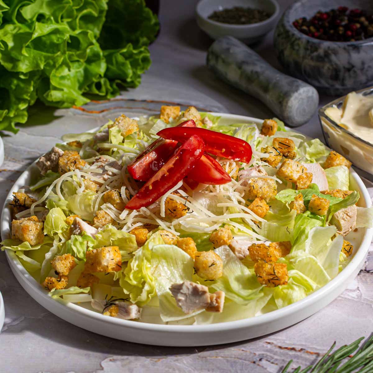 Хрустящие листья салат Айсберг и пекинской капусты, нежное куриное филе, поджаренное на гриле, сладкие помидоры черри, золотистые сухарики и солоноватый пикантный пармезан –- классическая основа салата «Цезарь». Мы готовим эту сочную закуску с оригинальной заправкой по фирменному рецепту из сметаны, майонеза, соусов Чили и соевого и ароматными приправами. Попробуйте нашу версию известного салата!