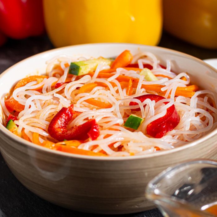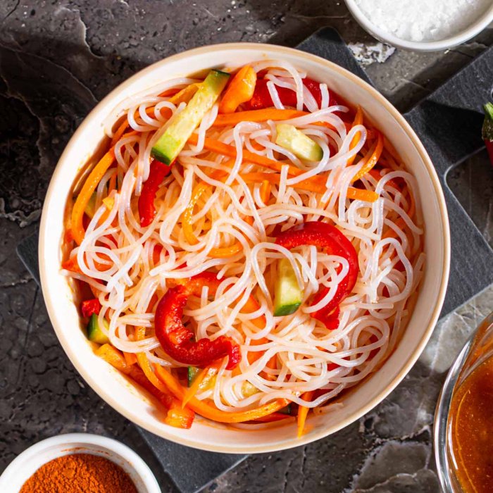 Фунчоза в сочетании со свежими огурцами, болгарским перцем, морковью и заправкой для фунчозы. Салат заправлен растительным маслом.