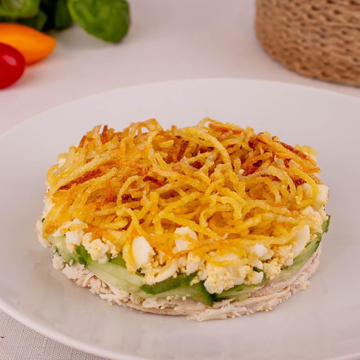 Знаменитый салат с курочкой и хрустящим картофелем-пай: приятная закуска с необычной подачей.