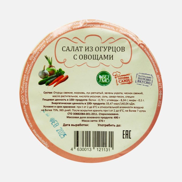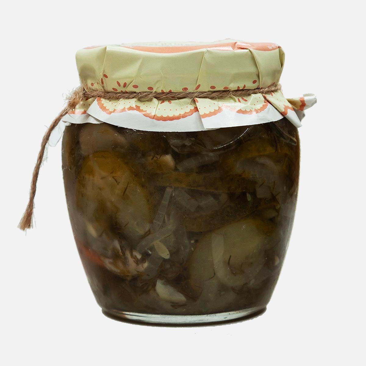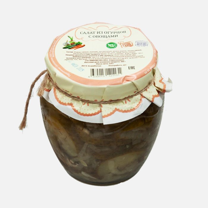 Огурцы свежие, морковь, лук репчатый, зелень укропа, чеснок свежий, масло растительное, кислота уксусная, соль, сахар-песок, специи.