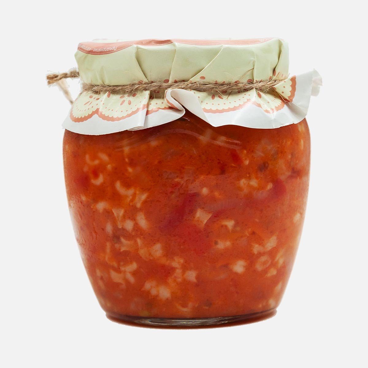 Рис клуглозерный, лук репчатый, морковь, перец болгарский, помидоры, масло растительное, кислота уксусная, соль, сахар-песок.