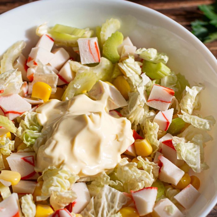 Капуста пекинская, крабовое мясо (имитация), стебель сельдерея, кукуруза консервированная, майонез, лук зеленый, соль поваренная пищевая