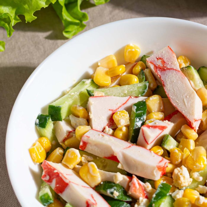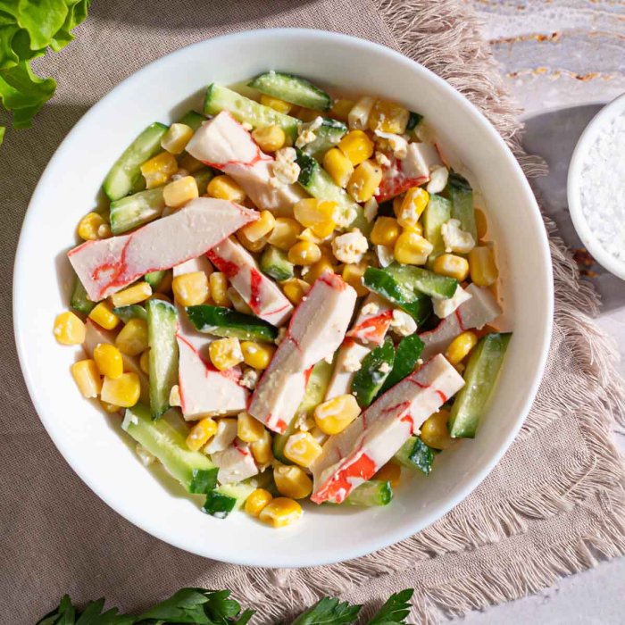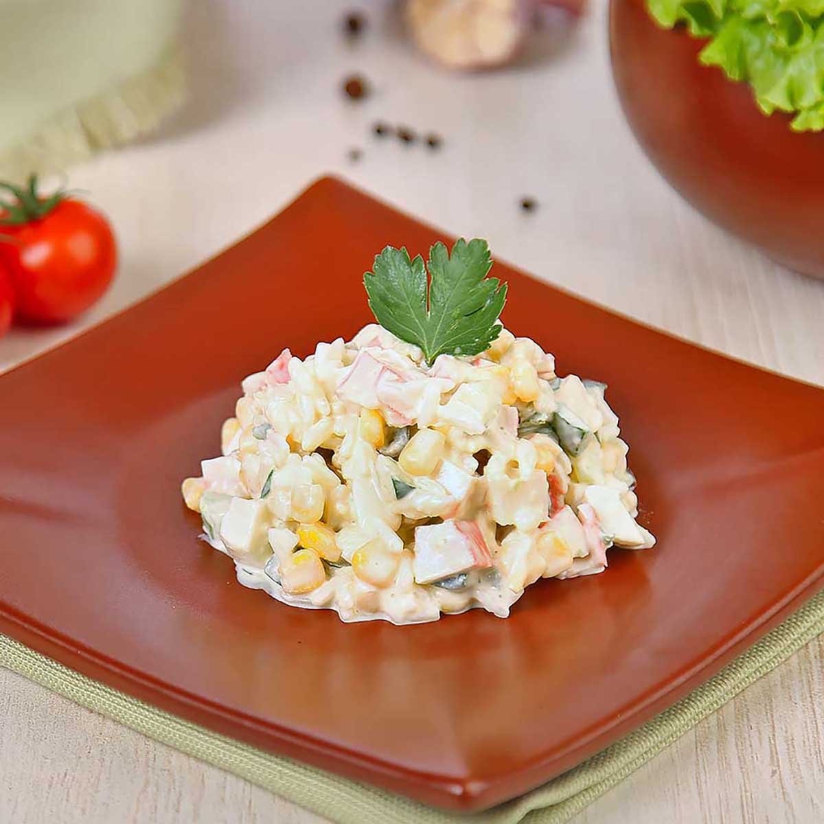 Крабовое мясо (имитация), огурцы свежие, яйцо куриное, кукуруза консервированная, майонез, соль поваренная пищевая, перец черный молотый.
