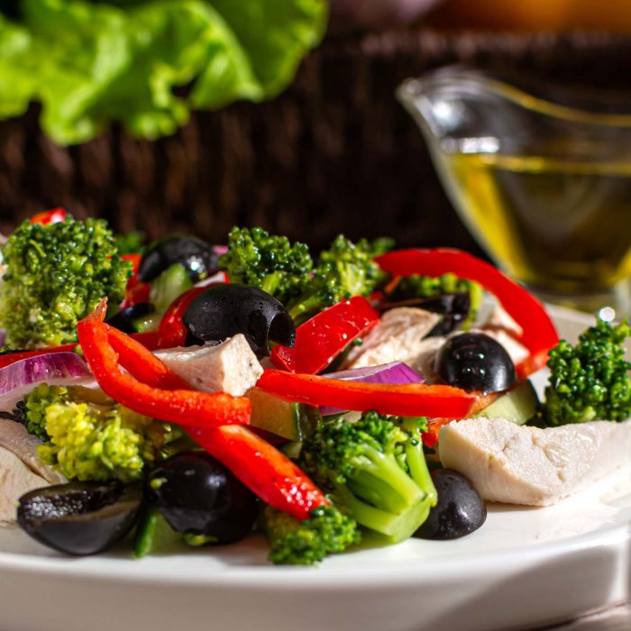 Легкий свежий салат с ароматной итальянской горчичной заправкой. В яркой тарантелле кружатся кусочки курной грудки, сладкий болгарский перец и морковь, огурчики и капуста брокколи, а также соленые маслины и колечки горько-сладкого красного лука. Красочный, сытный и очень легкий салат.