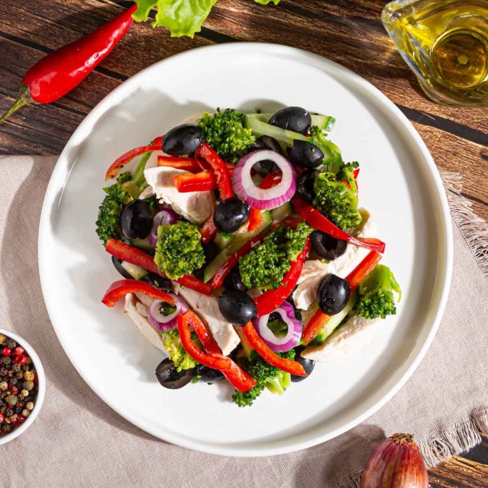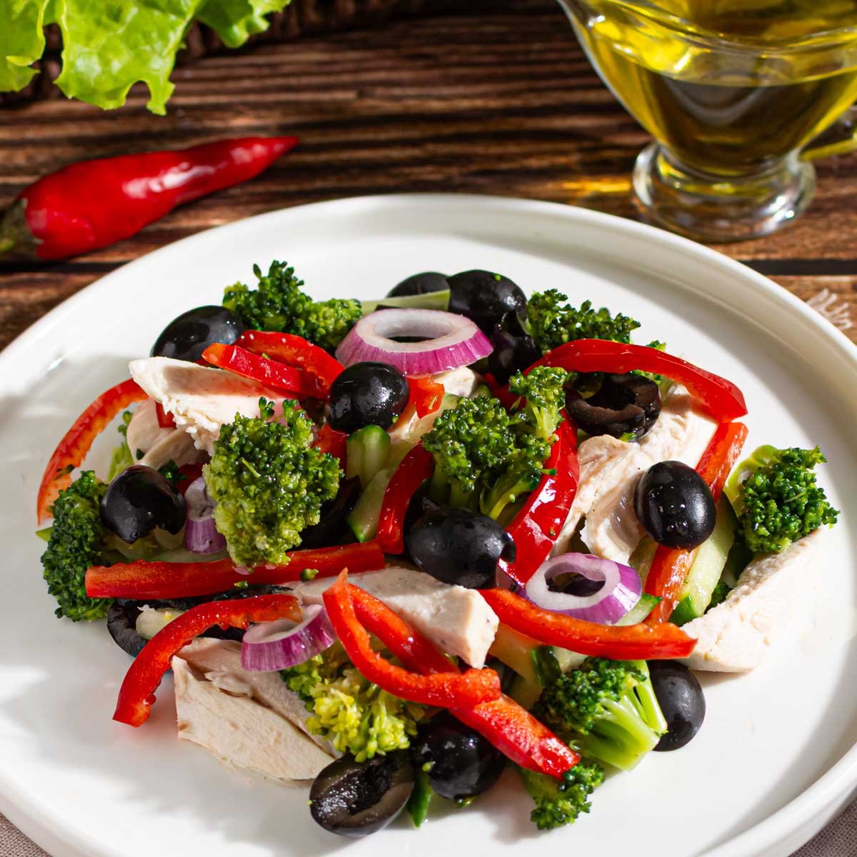 Грудка куриная охл, перец болгарский, огурцы свежие, капуста брокколи с/м, маслины консервированные б/к, лук красный репчатый, морковь свежая, горчица зернистая, масло подсолнечное, соль поваренная пищевая, перец черный молотый.