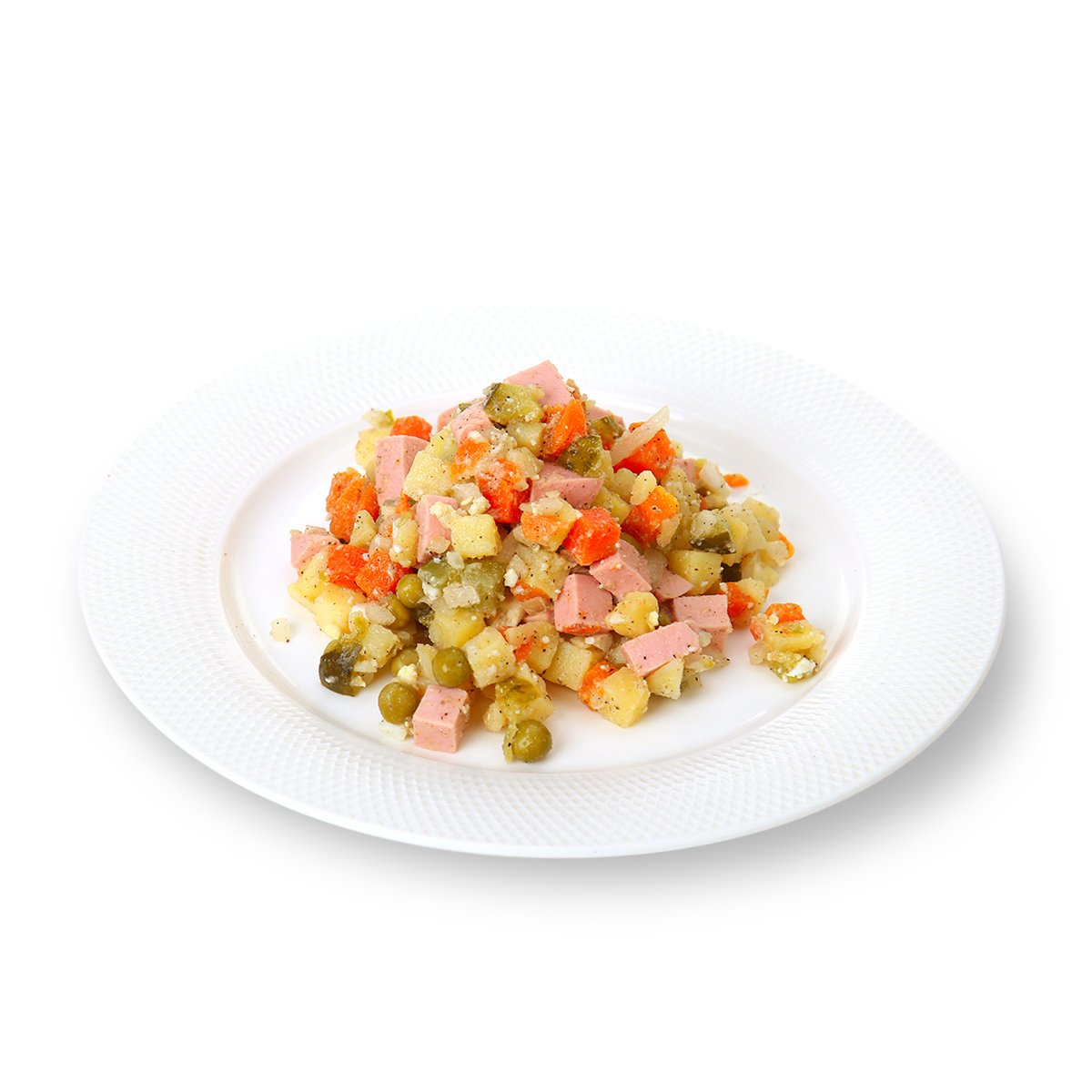 Колбаса вареная, картофель свежий, огурцы маринованные, морковь свежая, горошек с/м, яйцо куриное, лук репчатый, соль поваренная пищевая, перец черный молотый