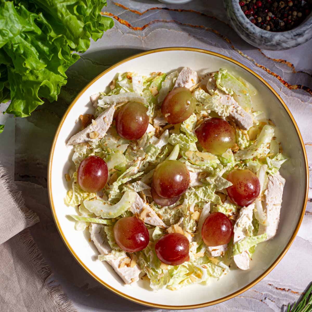 Сочный салат по оригинальному рецепту. Сытная куриная грудка, сочные зеленые стебли сельдерея, красный сладкий виноград, грецкие орехи – необычное, но вкусное и гармоничное сочетание. Салат идеален для торжественного повода, а любой будничный день сделает праздничным.