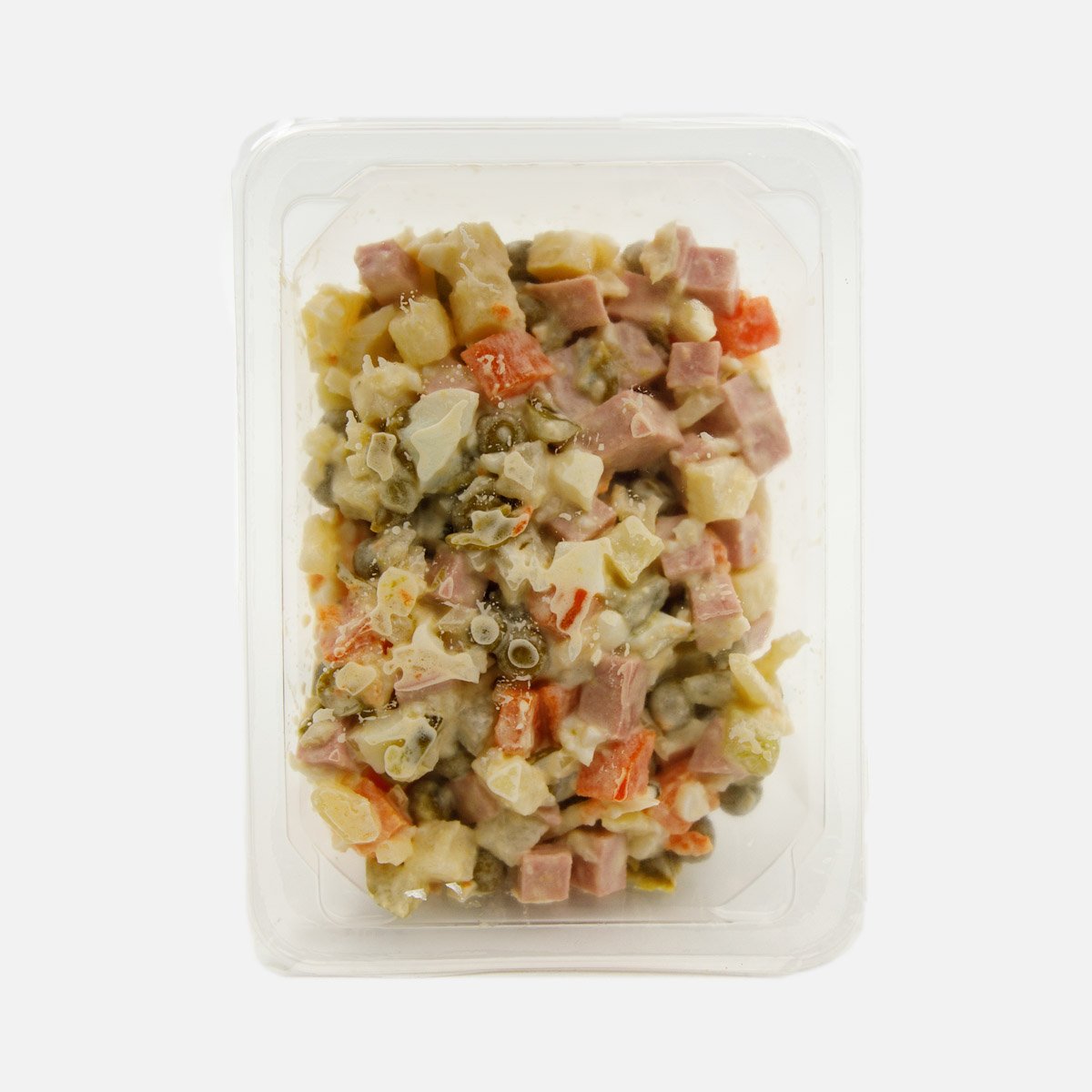 Огурцы консерв, зеленый горошек консерв, картофель, колбаса вареная, морковь, майонез, яйцо куриное, лук репчатый, зелень, соль, перец черный молотый. Упаковано с применением условий модифицированной атмосферы.