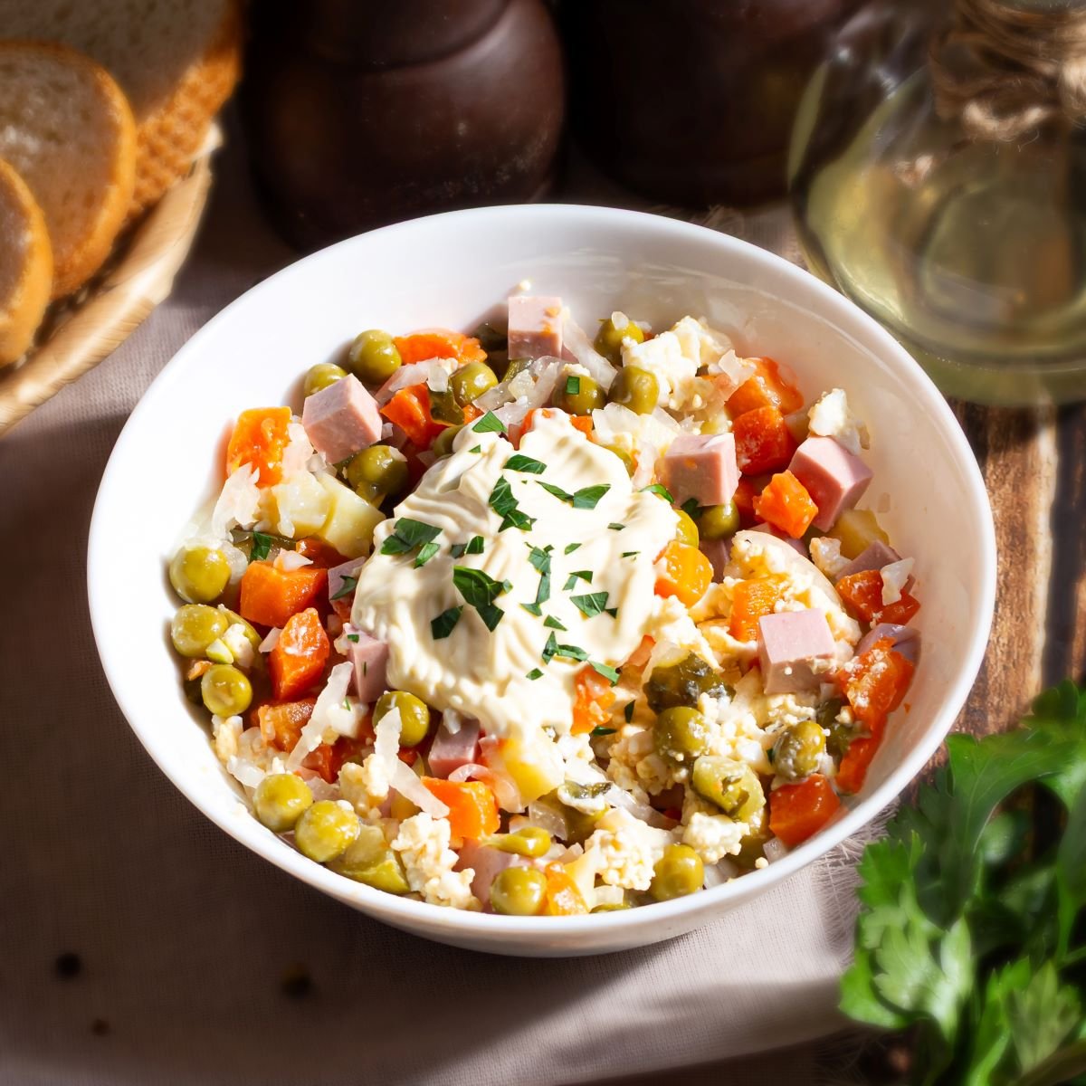 Один из самых любимых классических салатов, который, безусловно, является неотъемлемой частью праздничного стола. Закуска приготовлена из отборных отварных и консервированных овощей, сочной вареной колбаски, ароматной зелени и щепотки специй. Салат имеет привычный сбалансированный вкус с легкой кислинкой маринованных огурцов и сливочными нотками соуса.