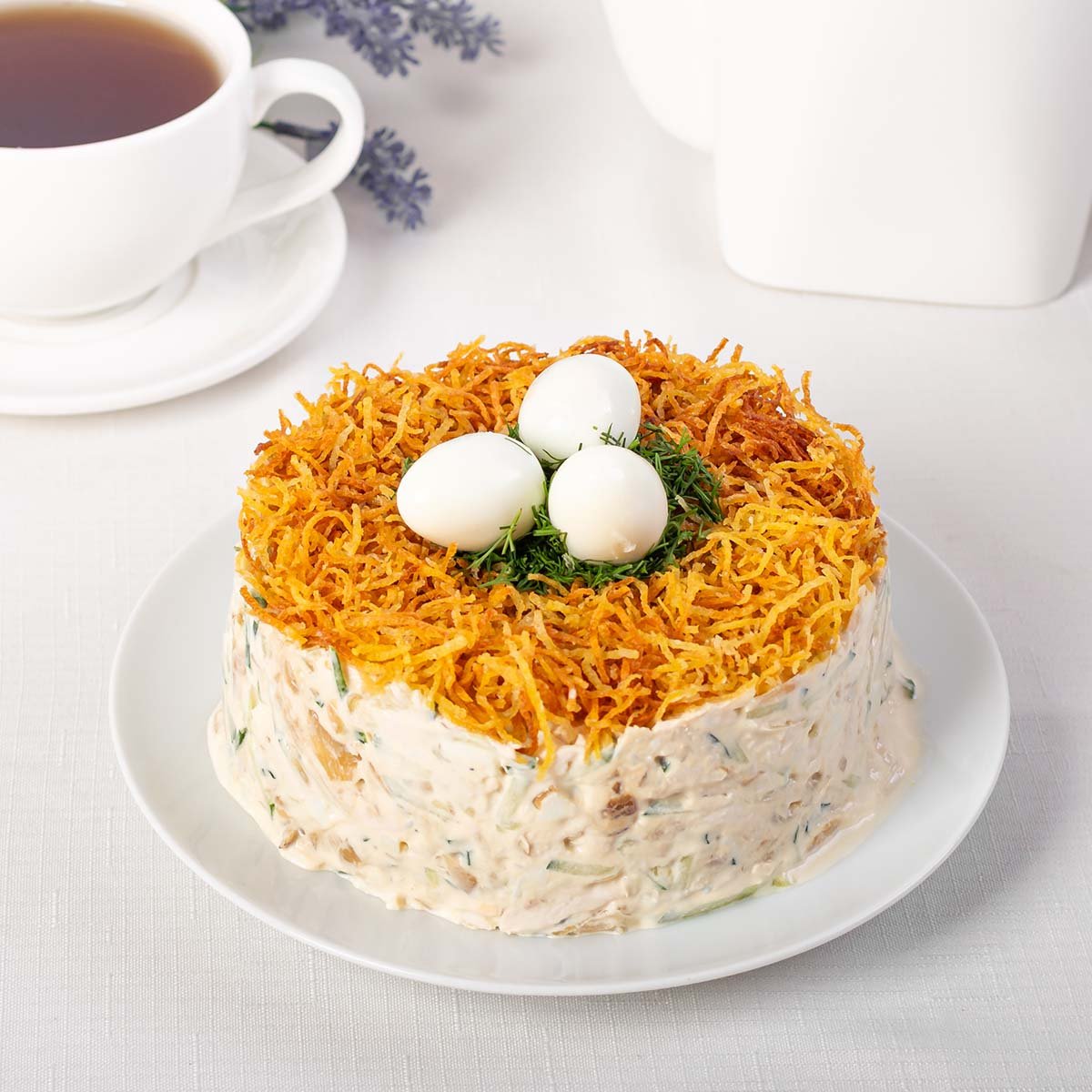 Знаменитый салат с курочкой и хрустящим картофелем-пай: приятная закуска с необычной подачей.