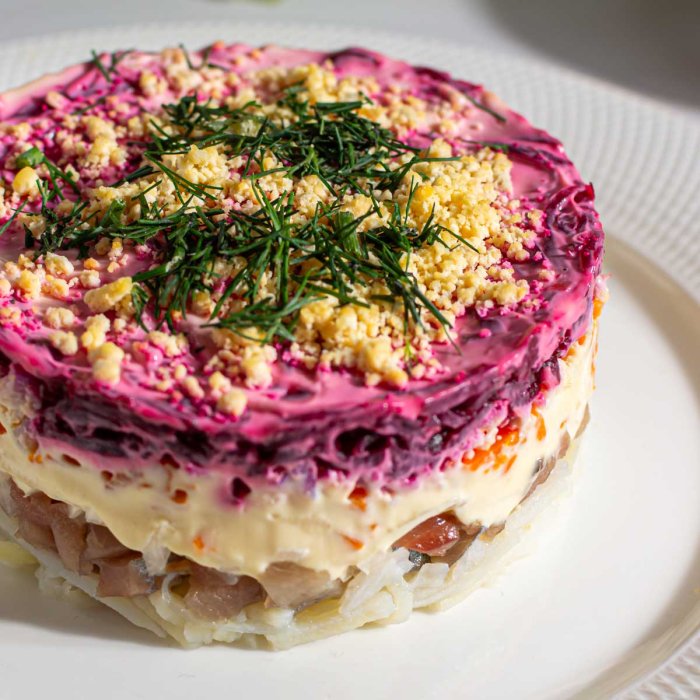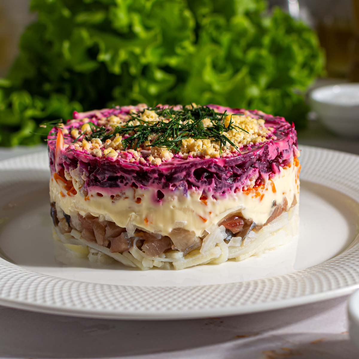 Легендарный слоеный салат в классическом исполнении. Только в меру соленая сельдь, морковь, картофель, свекла и немного яиц для украшения.
