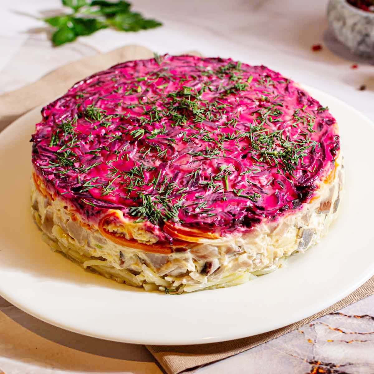 Кулинарная классика праздничного стола. Легендарный слоеный салат, история которого уходит своими корнями в XIX век. По одной из версий похожую рыбную закуску подавали на тожественном обеде в честь коронации Александра III. Мы готовим «Сельдь под шубой» по классическому рецепту: только в меру соленая сельдь, морковь, картофель, свекла и немного яиц для украшения. Насладитесь этим царским угощением!