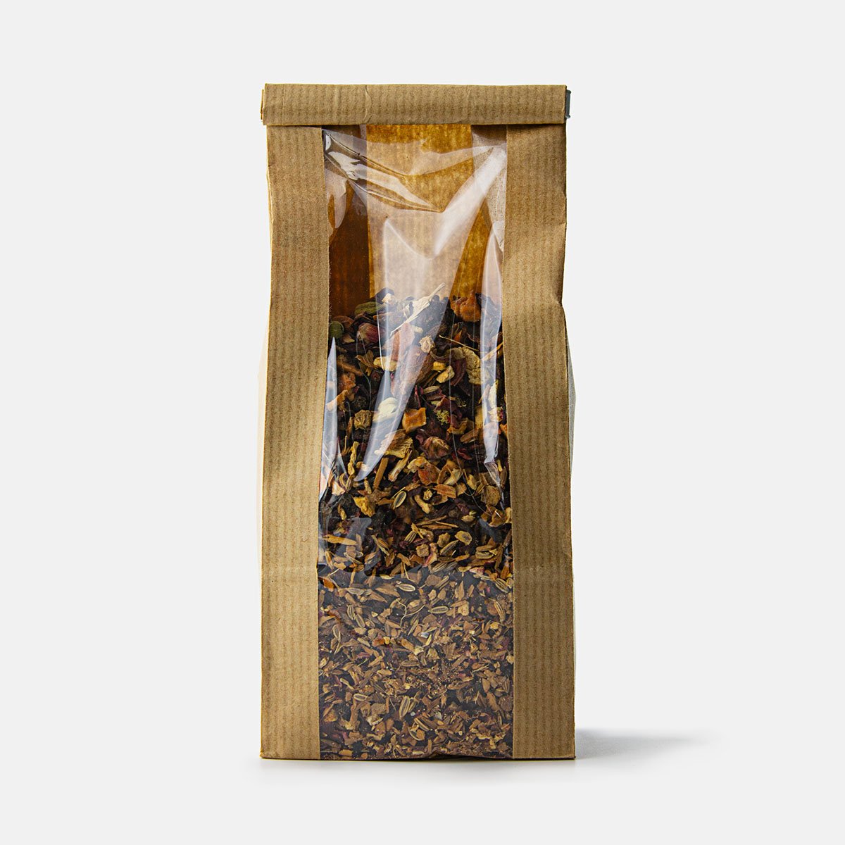 Каркаде (гибискус), корица, имбирь, кусочки яблок, бадьян, цедра апельсина, фенхель, кардамон, гвоздика, кусочки апельсина.