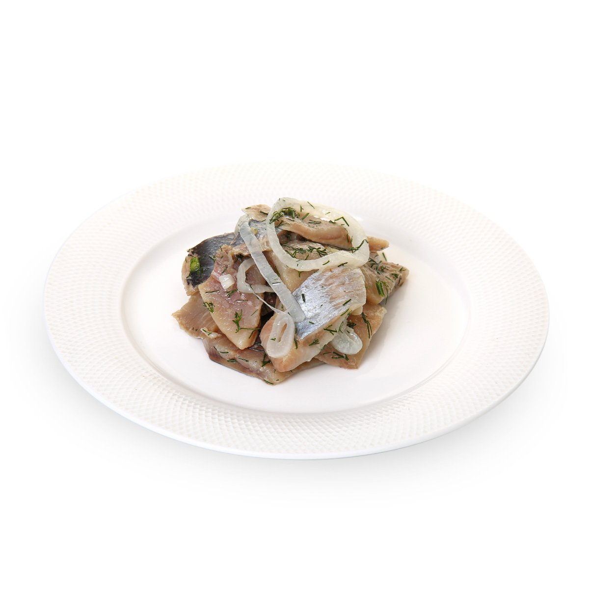 Сельдь с/м, лук репчатый, зелень, масло растительное, сахар, соль, уксус, перец черный горошек, перец душистый горошек, гвоздика, лавровый лист.