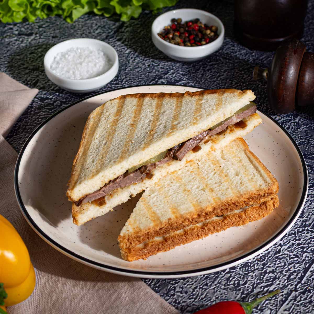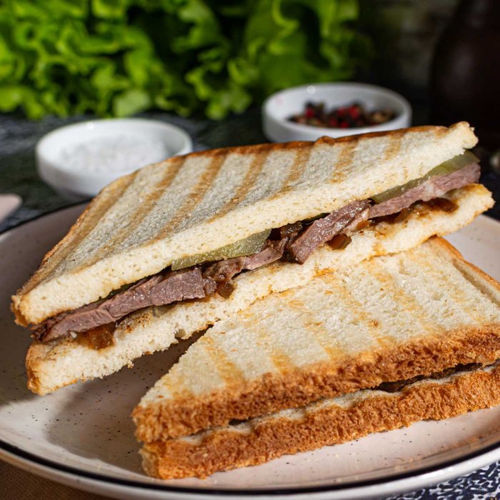 Хлеб для сэндвичей, ростбиф с маринованным луком, огурцы маринованные, горчица