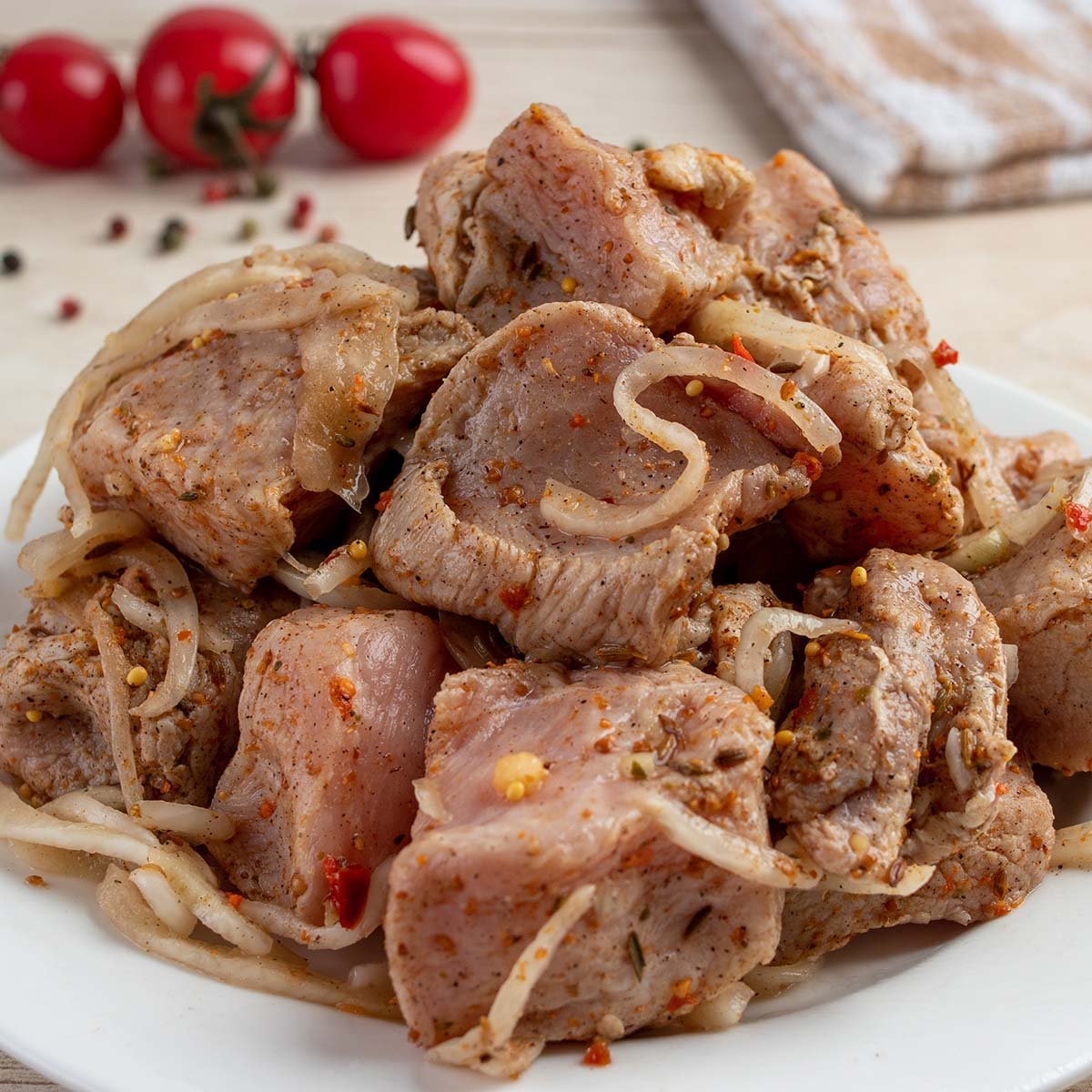 Свинина мякоть охл., лук репчатый, уксус столовый, приправа для шашлыка, соль пищевая