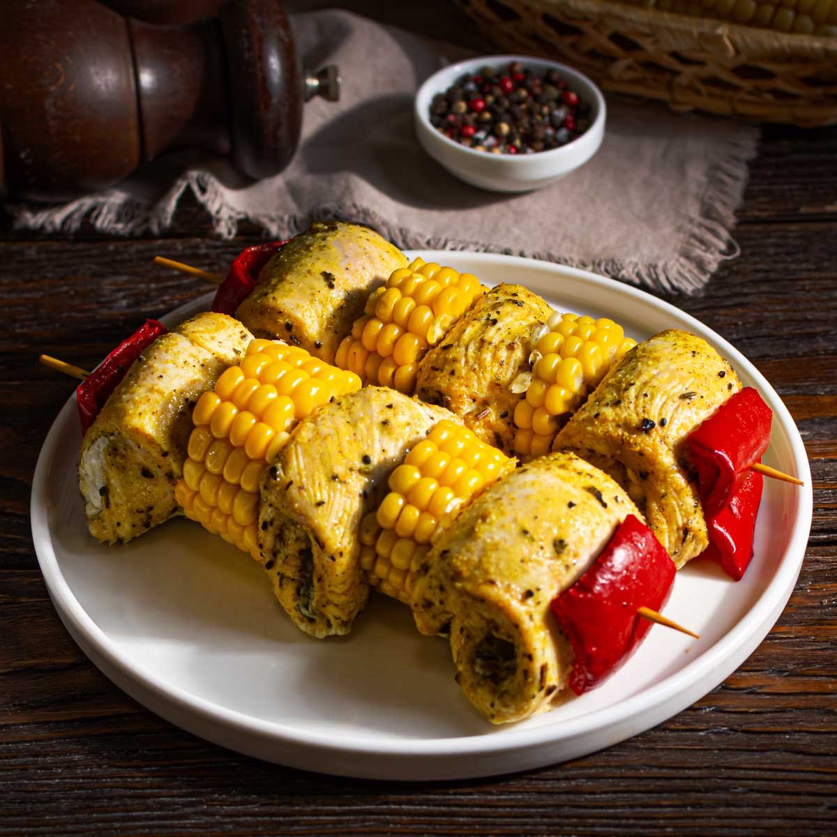Жареный шашлык из курицы с ананасами на шпажках. Внутрь нежного филе курицы спрятаны кусочки сочного ананаса. На шпажке чередуется с яркой кукурузой.