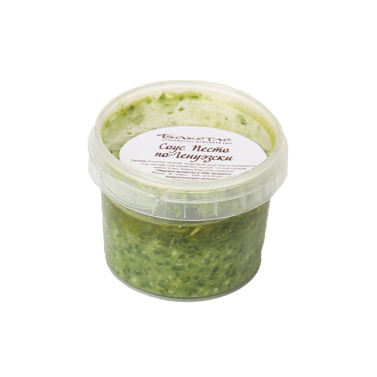 Базилик свежий, кедровый орех, масло подсолнечное, сыр овечий, сыр пармезан тертый, чеснок свежий, лимон (сок), перец белый молотый, соль пищевая.