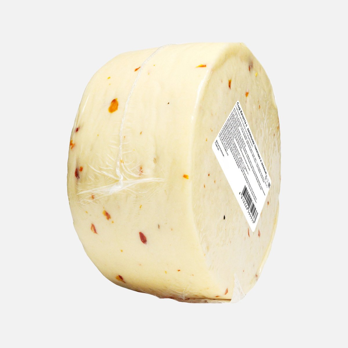 Молоко коровье цельное пастеризованное, наполнитель (базилик (зелень), петрушка (зелень), томаты вяленые, специи и овощи сушеные: томаты, чеснок, перец черный; сахар, соль, уксус винный, ароматизатор), соль поваренная пищевая, бактериальные термофильные заквасочные культуры, кальций хлористый (уплотнитель), нитрат калия (консервант), молокосвертывающий ферментный препарат микробного происхождения. Массовая доля жира в сухом веществе 45%.