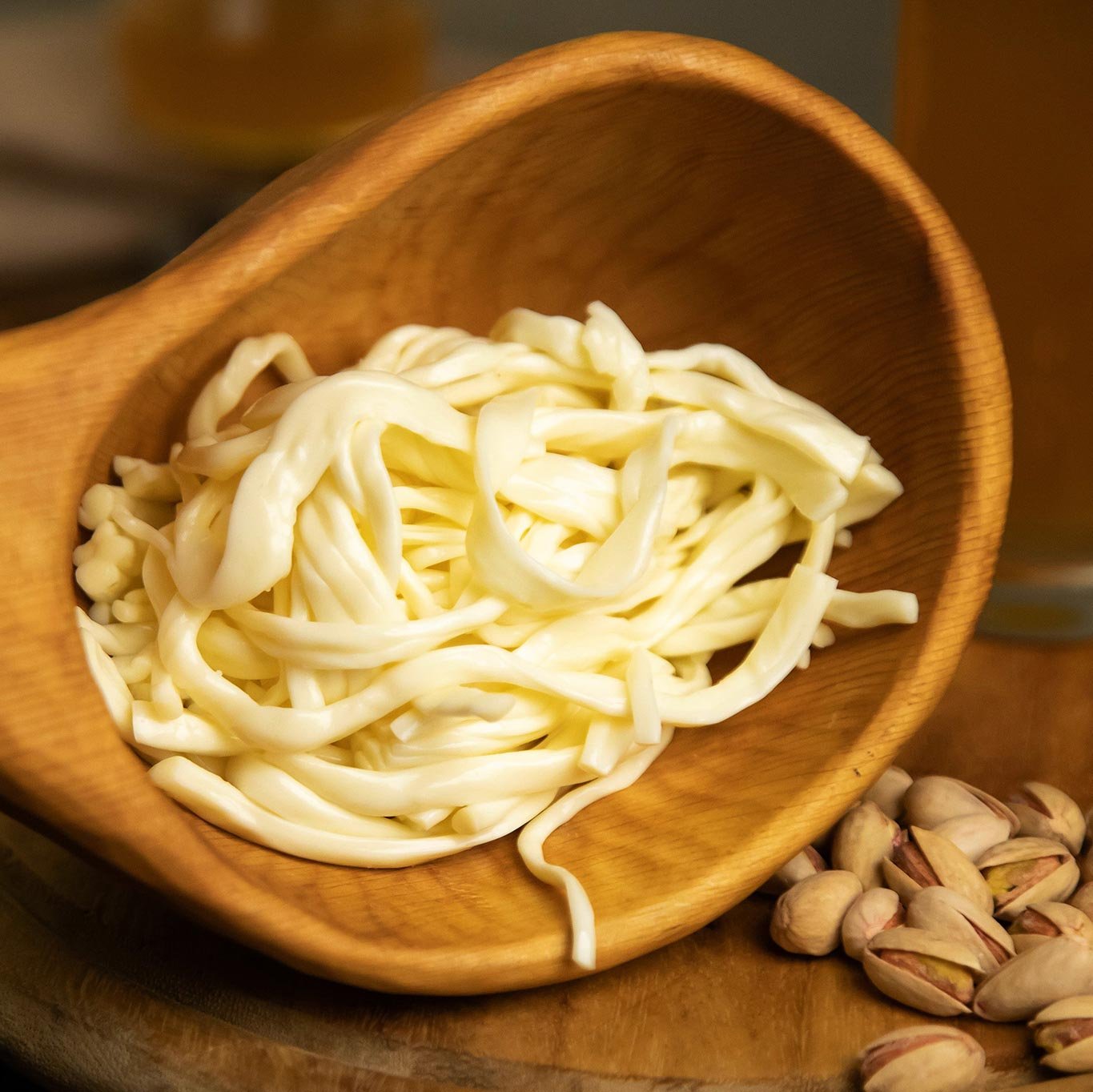 Чечил - национальная гордость Армении. Готовим его из отборного молока по классическому рецепту. Сырные нити вытягиваем вручную и бережно заплетаем в косы. Сыр имеет молочный солоноватый вкус и нежную текстуру. Его можно жарить, коптить или просто подавать в качестве закуски к пиву или вину.