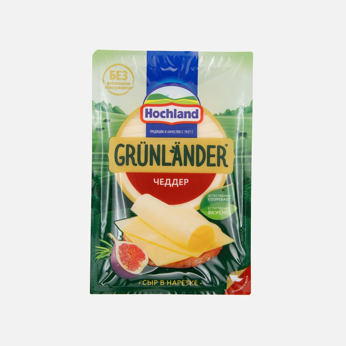 Сыр Хохланд Грюнландер Чеддер п/тверд нарезка 50% пл/уп 130г