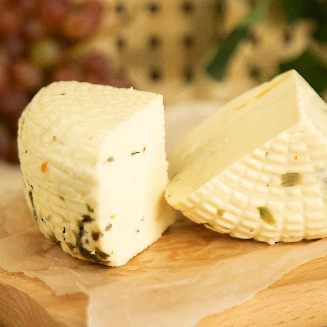 Молоко коровье цельное пастеризованное, соль пищевая, сычужный фермент микробного происхождения, базилик, майоран, орегано, паприка, петрушка, розмарин, тимьян. М.д.ж. в сух.в-ве 50%.
