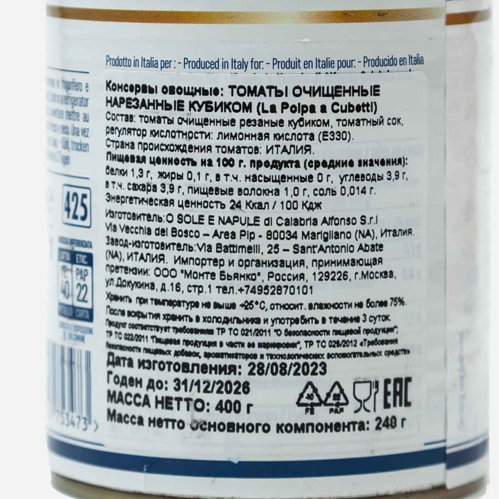 Томаты О Соле е Напуле очищенные нарезаные кубиком ж/б 400г