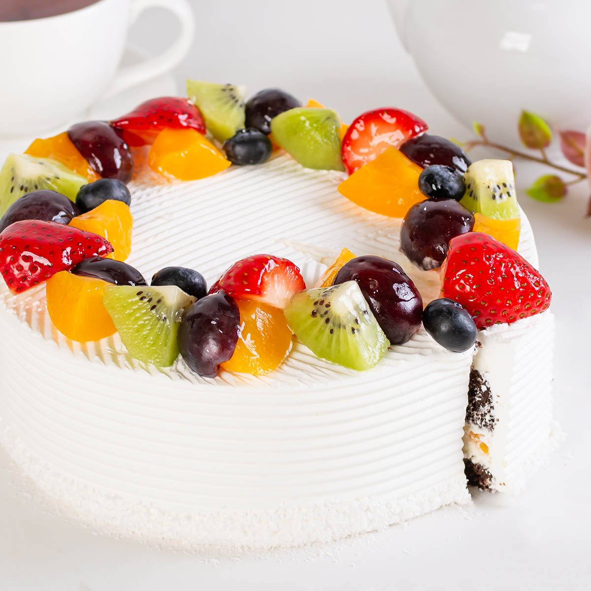 Лёгкий бисквитный торт с йогуртовым кремом и свежими фруктами. *Оформление торта может отличаться от фотографии представленной на сайте.