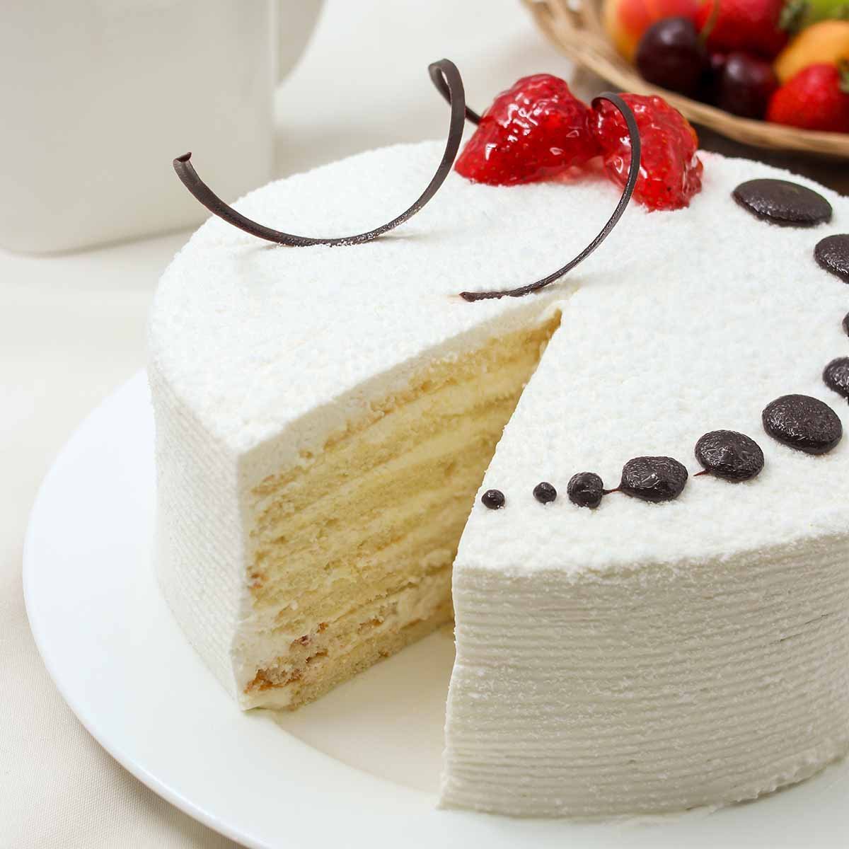 Белый бисквит со сгущеным молоком, крем из натуральных сливок. Украшен клубникой. *Оформление торта может отличаться от фотографии представленной на сайте.