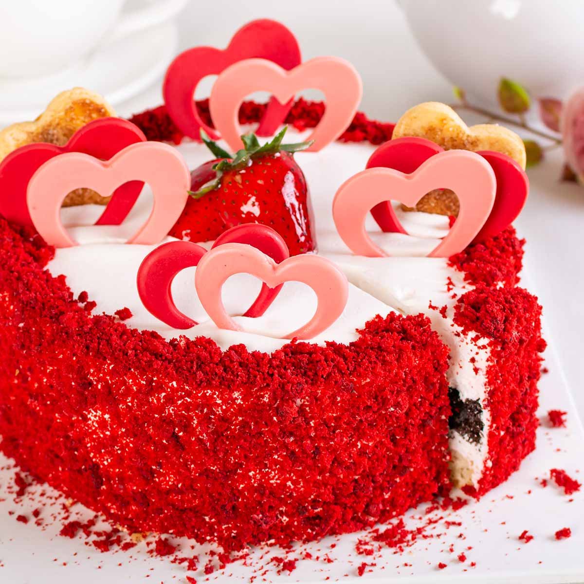 Мука пшеничная в/с, яйцо куриное, крахмал картофельный, какао-порошок, масло подсолнечное, йогурт натуральный, сливки растительные, желатин, клубника с/м, клубника свежая, шоколад белый, дражже сахарное, глазурь нейтральная, краситель пищевой.
