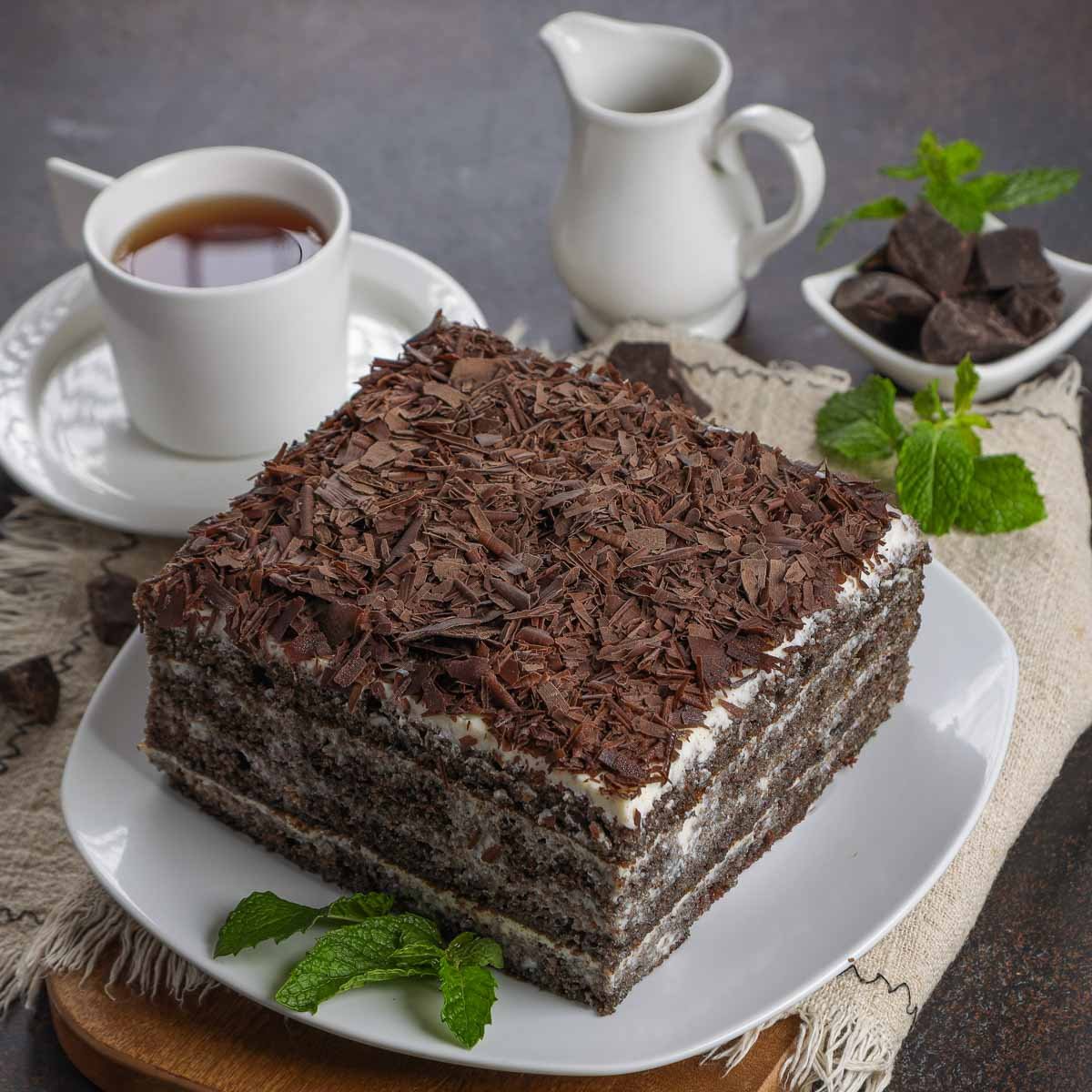Мука пшеничная в/с, молоко цельное, сахар-песок, сметана, сода пищевая, уксус, черемуха молотая, шоколадная глазурь, яйцо куриное