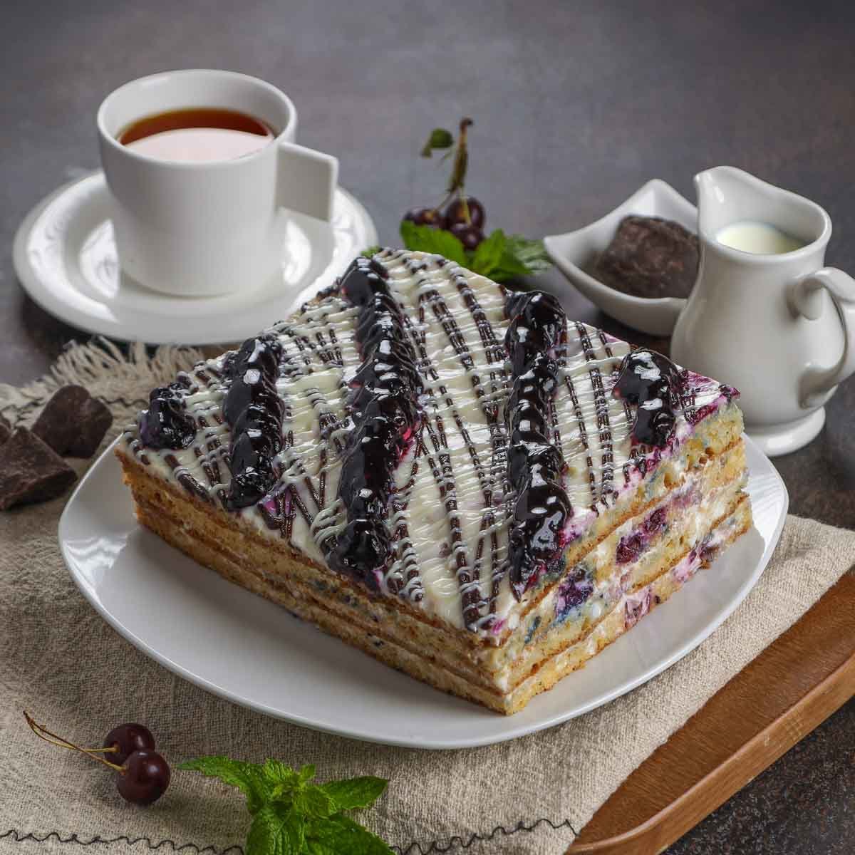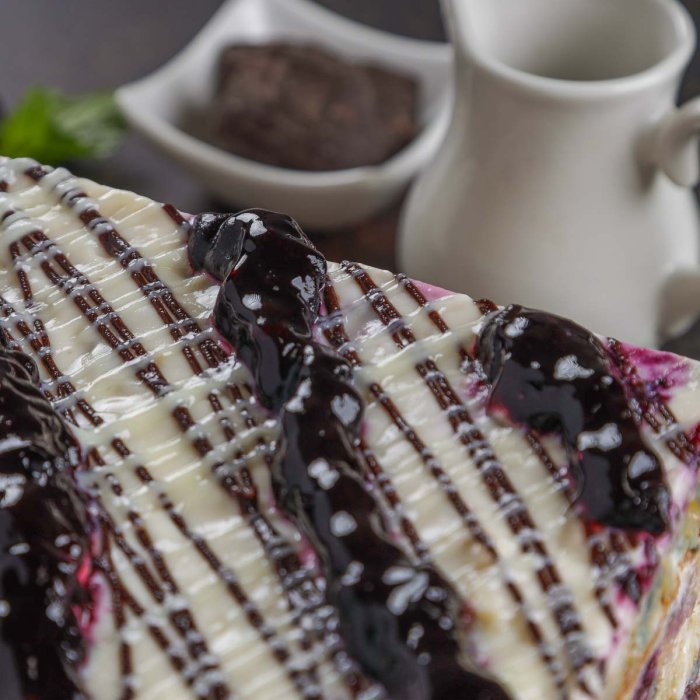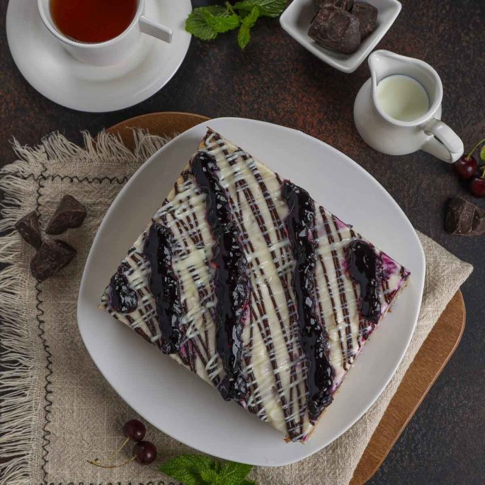 Мука пшеничная в/с, кефир, черная смородина с/м, сметана, сахар-песок, черника с/м,яйцо, крем покрытие белый шоколад, крем покрытие темный шоколад, сода пищевая, загуститель