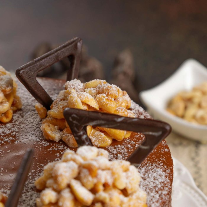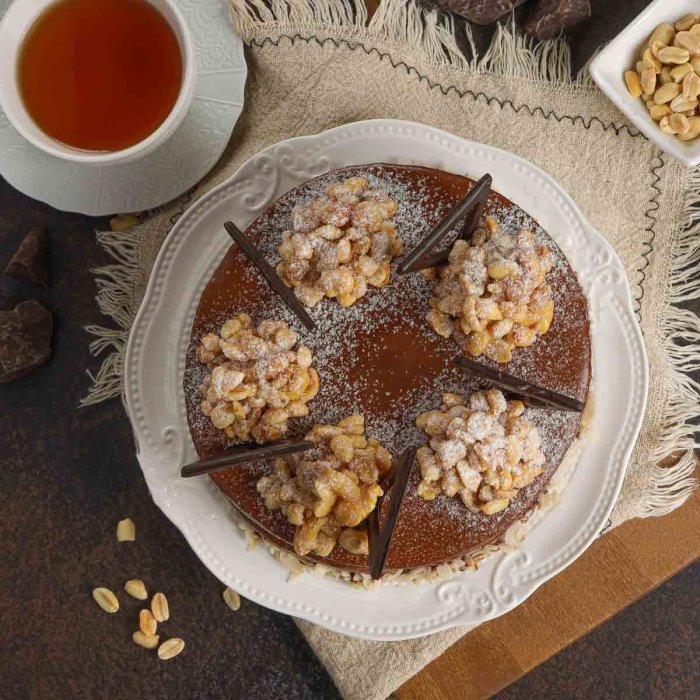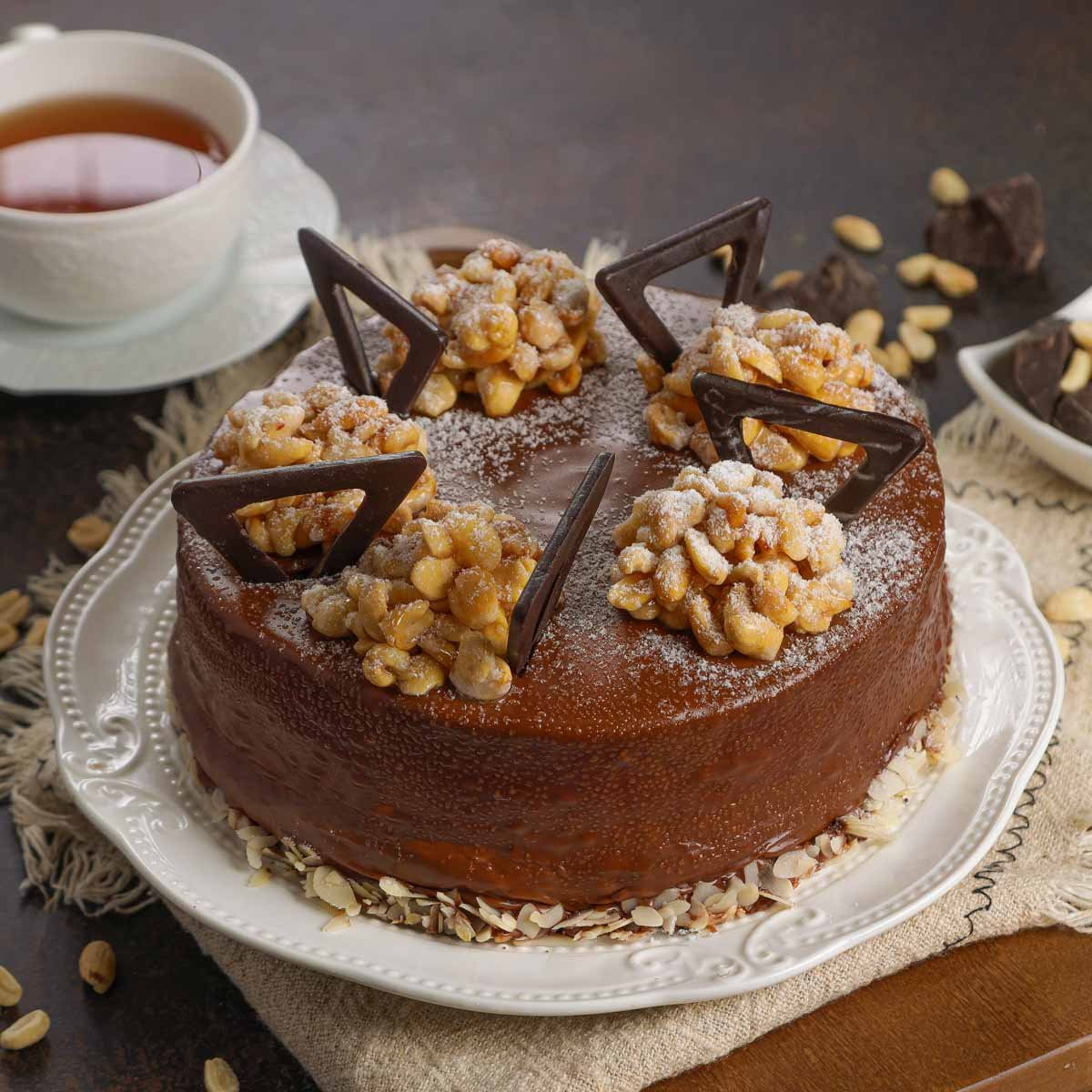 Сливки натуральные, сыр творожный, орех арахис, яйцо куриное, крем ореховый, сахар-песок, сахарная пудра, мука пшеничная в/с, какао-порошок, карамель мягкая, шоколад темный, глазурь нейтральная, ванилин, краситель пищевой
