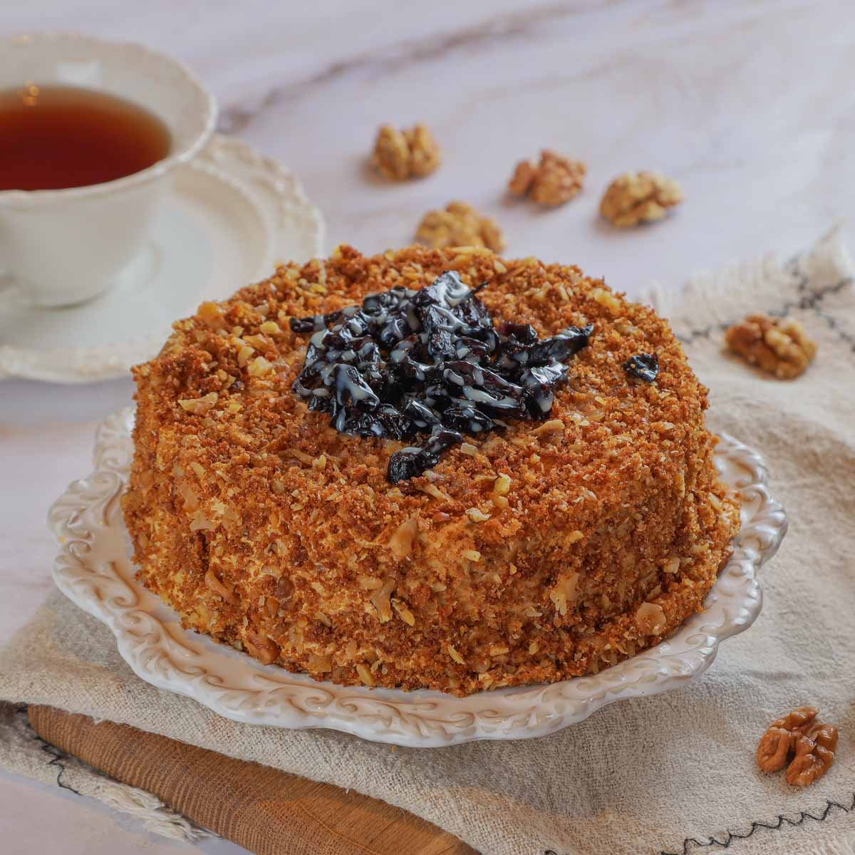Сметана, молоко сгущенное вареное, чернослив, сахар, мука пшеничная в/с, масло сливочное, яйцо куриное, орех грецкий, мед, молоко сгущенное, коньяк, уксус, сода, ароматизатор Ром