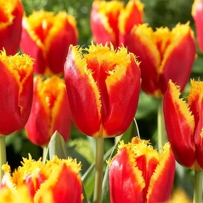 Бахромчатые тюльпаны! Один из самых интересных среди современных сортов тюльпанов. Отличительная особенность — игольчатая бахрома по краям лепестков, напоминающая иней. Очень красивы, они просто завораживают. Имеют малиново-красный с золотой густой бахромой. Высота 35- 50см. Высота бутона - 5 см. Выращены в России.