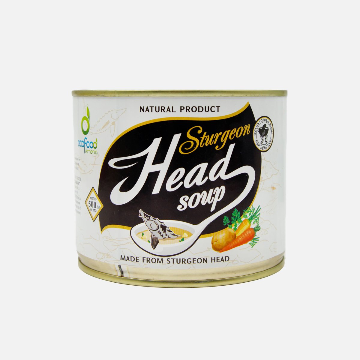 Голова осетра с мясом, картофель, морковь, укроп, петрушка, лук репчатый, черный перец, лавровый лист, растительное масло, соль, вода. Без ГМО.