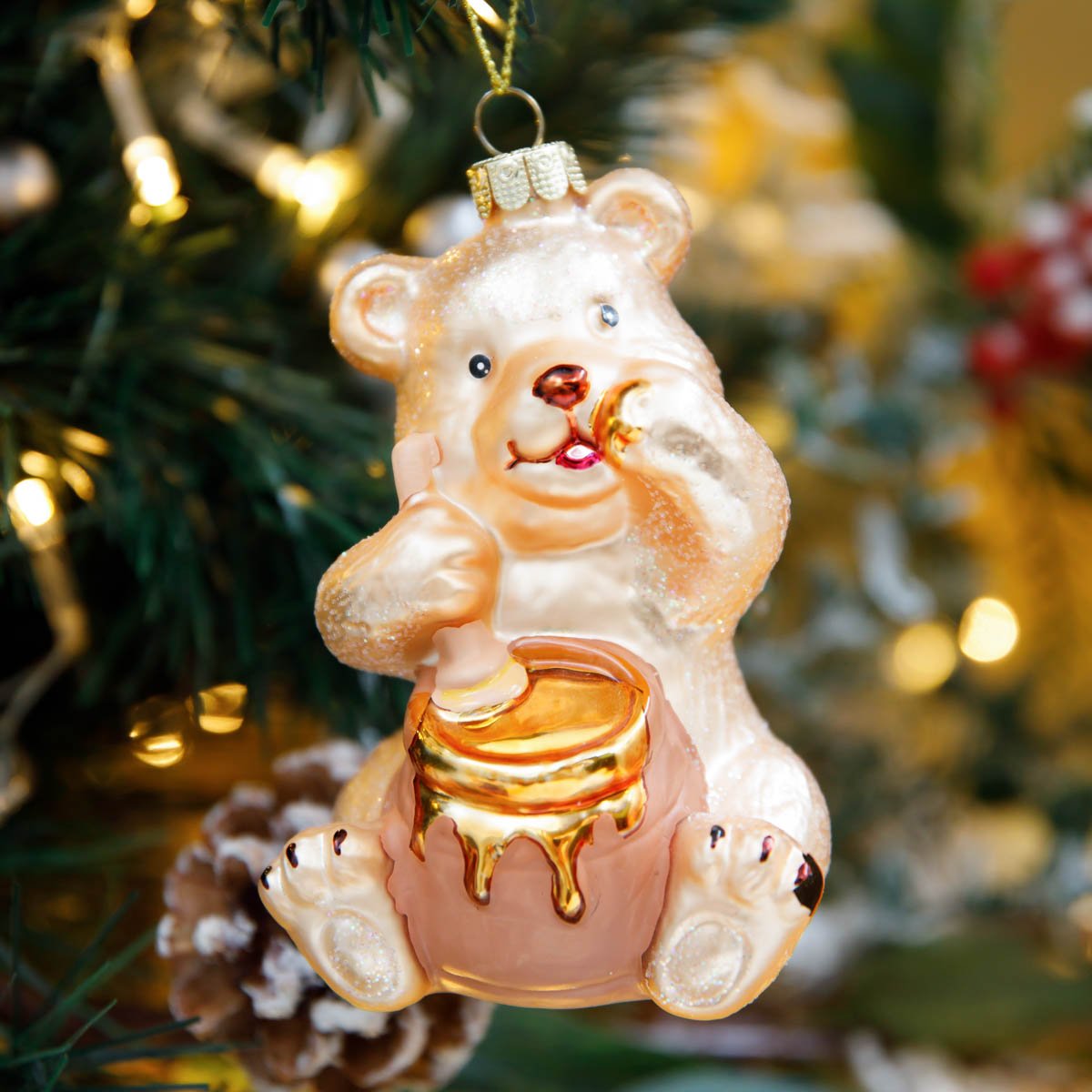 Украш елочХолидейКлассикМедвежонок с бочонком меда стекло 7х6,5х10см