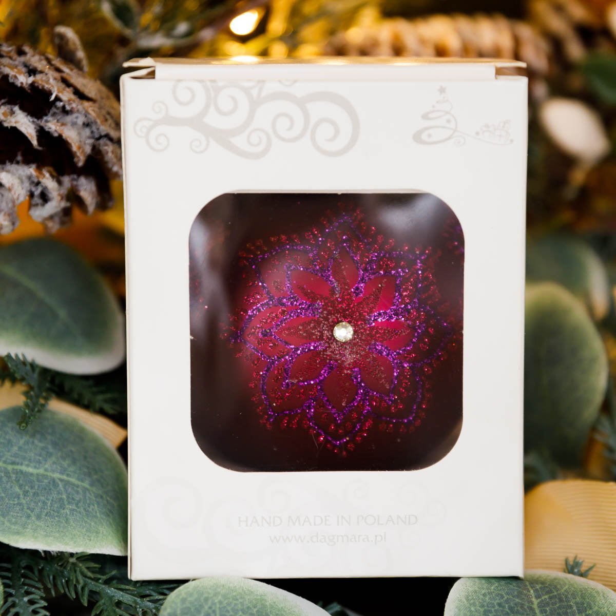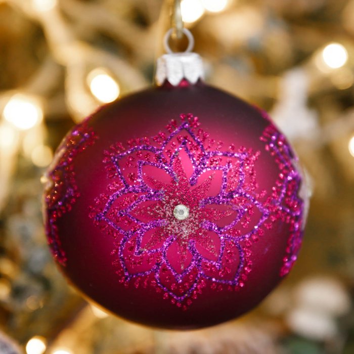 Украш елочШар фуксия матов с лилов искр снежин и страз руч раб п/у 8см